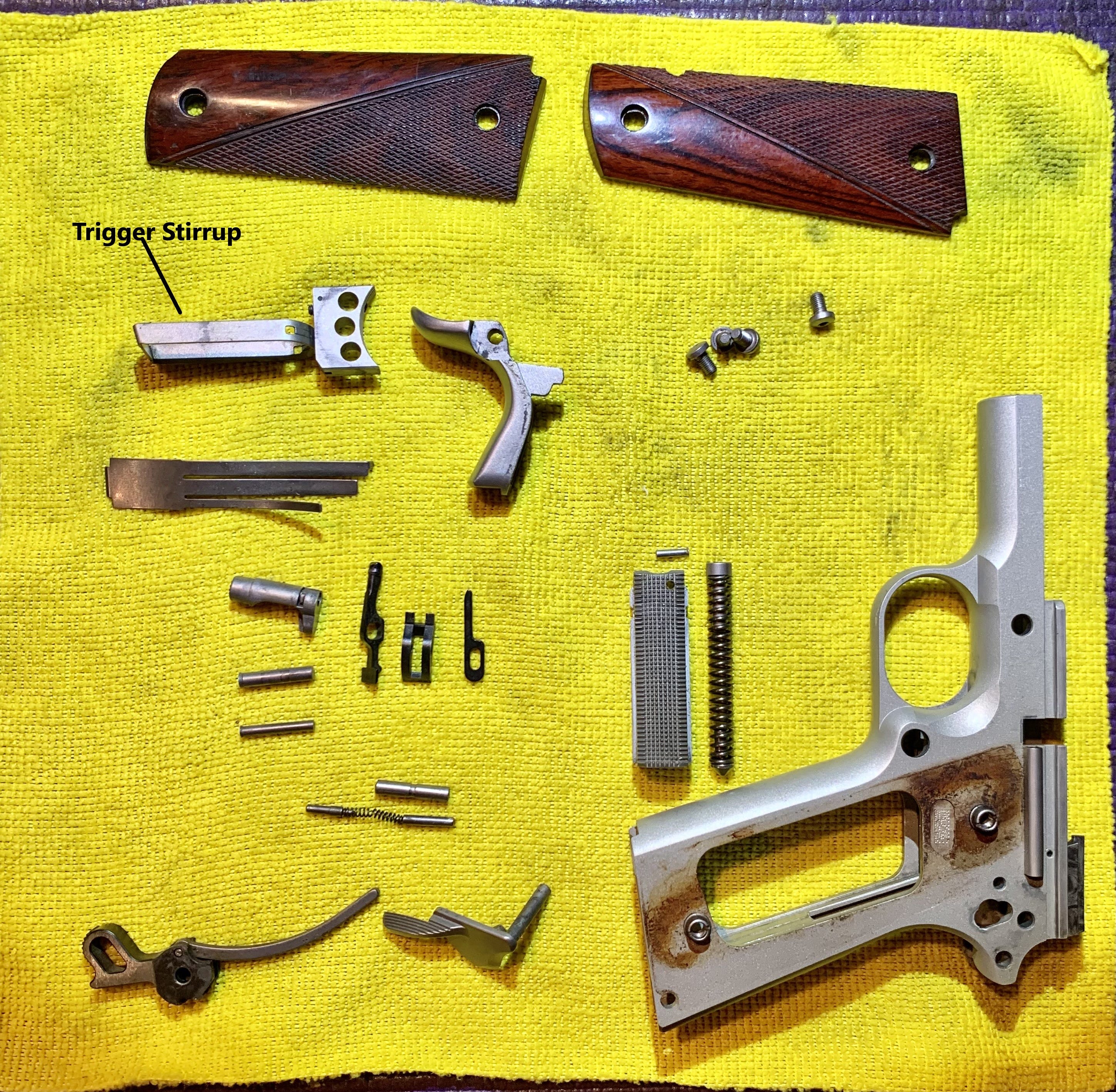 The two pictures below show the pistol disassembled with all the parts laid out prior to cleaning. One of the reasons I wanted to do a complete disassembly was to clean the trigger stirrup and the slots that the trigger stirrup moves in. Over time, these get dirty. Cleaning behind the trigger stirrup requires removing the trigger from the frame. 1911’s have great triggers. Keeping the trigger stirrup clean matters. It matters with the other parts as well.